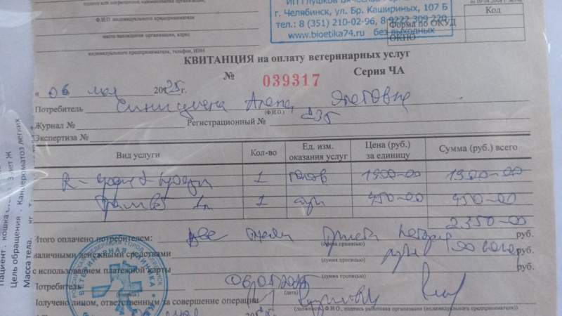 Лена З. недавно мне сообщила, что кошка сегодня громко мяучит, отказ от корма. Бегала- разъезжались лапки. Когда я навещала кошек 11 числа я заметила, что что-то не совсем так с Варей- мяукала, бегала, но вроде как в этот день она ела до моего приезда, мне сложно судить, я не часто кошек навещаю на передержке. Могу только внешне оценить. Да и вечером Лена прислала фотку, что кошка поела. Сегодня кошка отказалась от корма. Лена З. отвела в клинику сейчас. Я поговорила с доктором. Врач говорит- тугор 3 секунды (признак ХПН), шерсть свалявшаяся, перхоть. Признаки почечной недостаточности. Десна кровят. Плюс кошка на тивикае, дозу будем повышать до 2,5 мг на кг- десна кровоточат, это бывает и при ХПН и при лейкозе. Я предположила вообще тромбоэмболию, так как когда лапки слабеют и болевой синдром- такое бывает. Врач отрицает признаки. Но у кошки также мочевой напряженный, надо стоп-цистит начать. По-хорошему кошке нужно: 2600 УЗИ+1300 ПРИЕМ уже нужно оплатить+700 рентген+1850 биохимия+850 общий+300забор крови= 7600 Но так как в этой клинике нам в долг не делают, а наша основная пока не работает, то мы не можем единовременно сразу выложить эти суммы и решили пока что ограничиться ОАК, биохимией и оплатить прием и забор крови Сумма будет 4300 сейчас надо уже оплатить