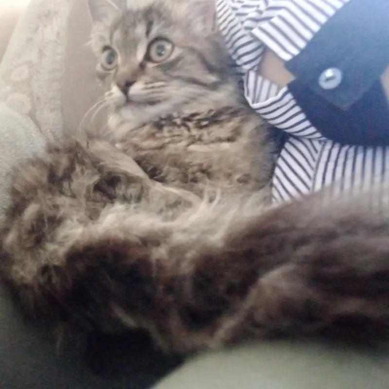 Девица, месяца 4. Пушистохвостая. Тихоголосая (пока). Намывается интенсивно, чистюля.