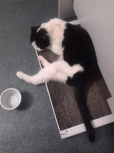 Однозначно он - жертва тупого разведения. Ни на что, кроме еды не реагирует , но ест с удовольствием и даже просит. После трапезы умывается. Прям жалкий-жалкий. Из клетки не рвется, устал мыкаться по улице, но впечатление, будто в клетке всю жизнь и прожил. Взгляд такой мудрый, хотя, возможно, это уж у меня разыгралось художественное воображение. Сегодня тихо помуркал. обенно слезу вышиб тем, что в лоточек сходил. Моча почти не пахнет. Может, и правда, кастрат. Или почки в плохом состоянии. При этой новой информации уже вроде и планы поменялись. По уму бы анализы сдать, УЗИ сделать. Чтоб было вообще о чем говорить. Но пока не торопимся, пусть хоть отдохнет недельку, подкормиься, да в итоге обследование да при необходимости операция в кругленькую сумму складывается(( более удачное фото лап. Казалось , искривление суставов. А пощупала, это шкурка. Га лапы он опирается. Но если это такой отек.... Опять, блин, подозрение на артрит, заболевание почек, сердца.. Сама вот сижу и нагнетаю...
